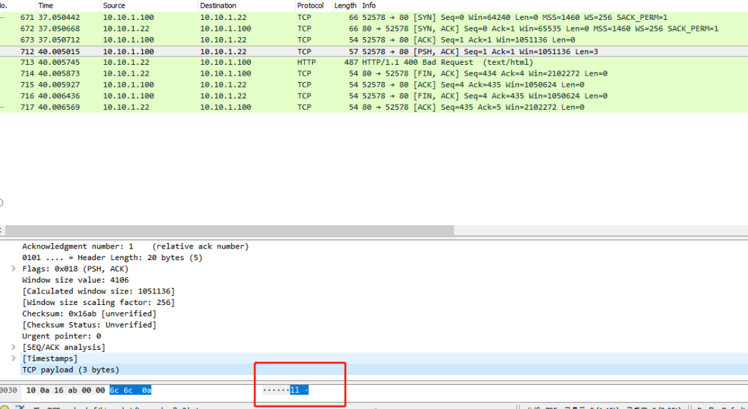 整个的过程中攻击机先与靶机建立一次3次握手连接,然后再tcp payload中添加11数据(手动发送的),得到一个HTTP的返回包,然后再四次挥手断开连接。