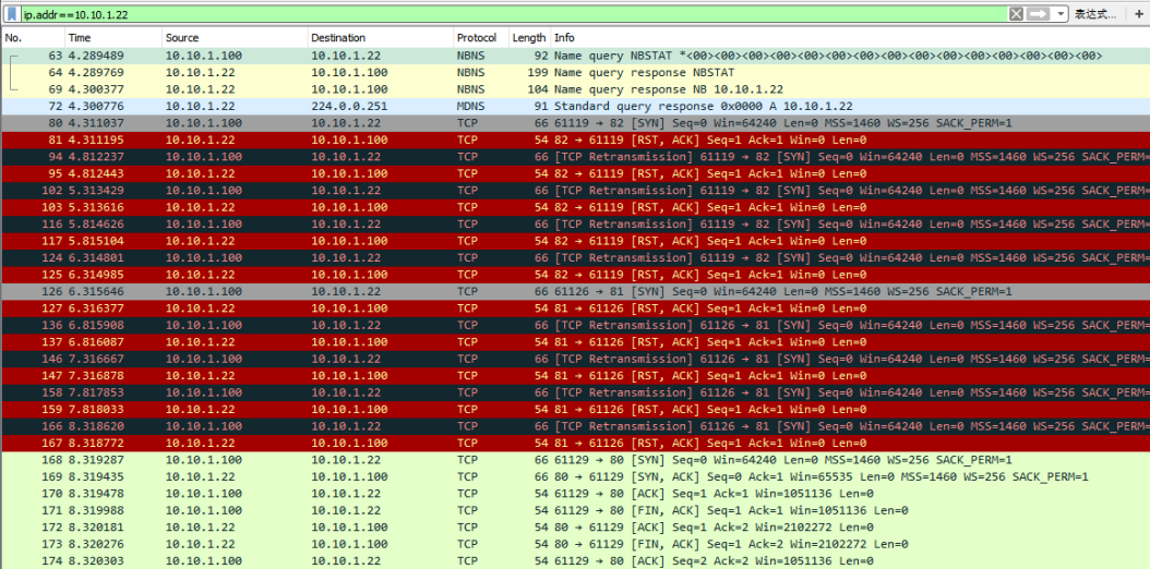 可以看到,攻击机先对靶机发送NBNS请求,靶机回复NBNS响应包带着自己的主机名和IP,然后尝试与82、81、80端口建立握手,在于80端口建立握手后马上四次挥手断开连接。