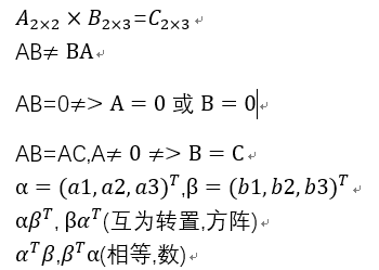3.乘法运算,A的列等于B的行,且对应元素相乘再相加