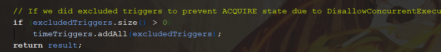 通过对 Job 类上的是否存在 DisallowConcurrentExecution 注解,如果存在,表示拒绝并发执行 execute 方法。如果与即将执行的 Trigger 调用同一个 JobDetail 对象,则将当前 trigger 放入等待列表。