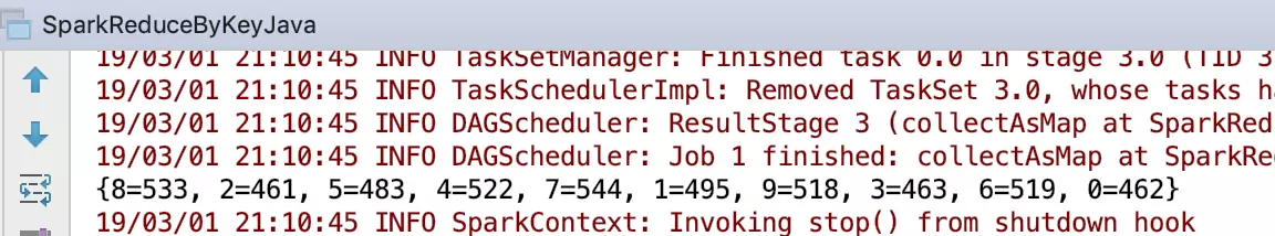 public Integer call(Integer integer, Integer integer2) throws Exception { return integer+integer2; } }).collectAsMap()); } public static void reduceByKeyJava8(JavaSparkContext sc){ JavaPairRDD<Integer,Integer> numData = sc.textFile("./avg").mapToPair(s->new Tuple2<>(Integer.parseInt(s)%10,1)); System.out.println(numData.reduceByKey((x,y)->x+y).collectAsMap()); } }