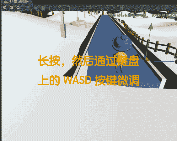 还有就是用过3D模式的都知道,在3D模式下调整相机视角和位置的操作是相对来说比较困难的,之前的项目中也实现过一个2.5D的场景,所以也这里也分享两个快捷键,一个就是调整物体的时候,点击住屏幕,在视图左上角会出现wasd(上下左右)的提示,可以通过键盘上wasd这四个按键来微调方向,相对来说会便捷很多