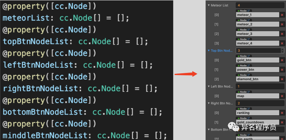 在处理复杂界面的时候,因为页面上的元素较多,就算我们尽可能地拆分脚本,但是在一个脚本里面需要绑定的变量还是不可避免的增多,然后代码里面就会有一大串@property声明的变量,所以新手们需要充分利用的类型,比如我有10个只是单纯用于的显示和隐藏的node节点,就可以通过声明一个node数组节点来绑定,这样子我在代码里面显式声明的变量就会少很多👇