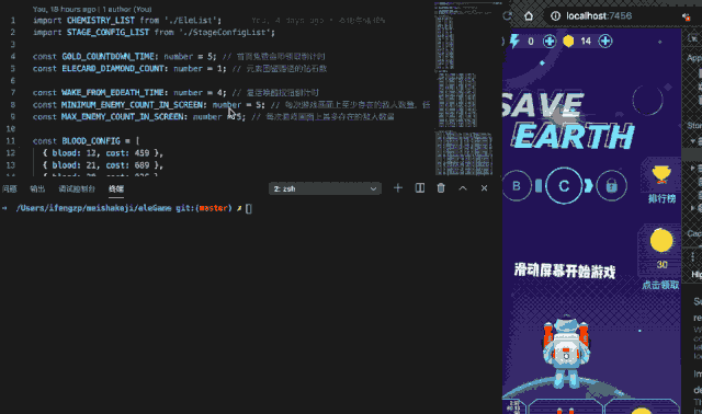 代码提示和文件搜索我就不提了。在正常情况下我们修改了代码,只有回到cocos界面才能触发项目实时热更新,而我们在vscode上配置好编译的task,并且设置启动task的快捷键,我设置的快捷键是cmd+r,我们就可以在vscode上通过快捷键触发项目的热更新,它可以让我们在写代码的时候更专注在代码上;具体的配置步骤可以查看文档