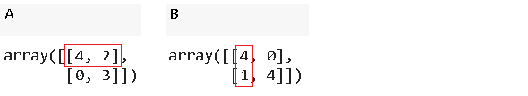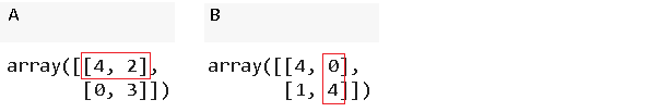 2x2矩阵有2行2列。行和列的索引以0开头。例如,A(索引为0的行)的第一行是[4,2]的数组。A的第一列是[4,0]的数组。第一行和第一列的元素是4。