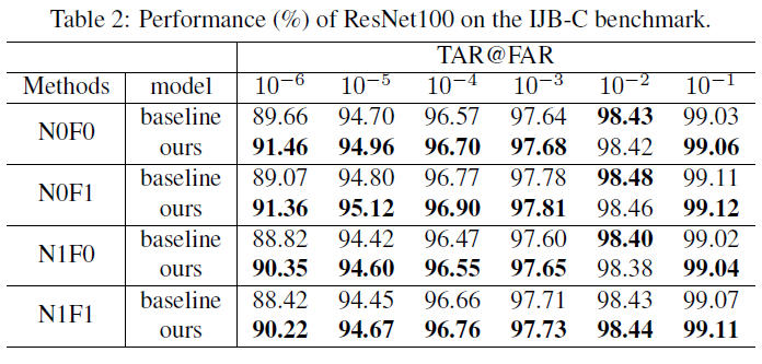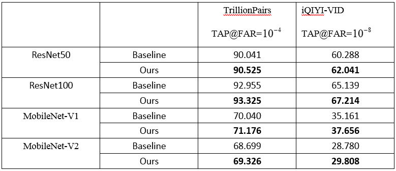 分别在iQIYI-VID和Trillion-Pairs和IJB-C三个测试集上验证了方法的有效性。测试了四种骨干网络,实验结果说明,加入无标签数据的UIR loss后,模型性能有所提升。由于篇幅原因,IJB-C测试结果只贴了ResNet100部分,其他结果可参照论文。