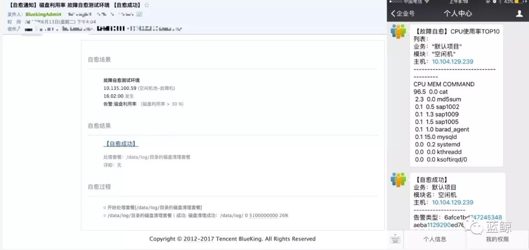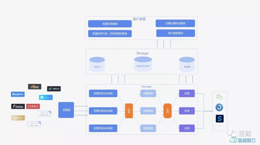 故障自愈可能会处理失败,这时需要通知用户。故障自愈的处理方式除了调用作业外,还可能需要调用企业内部的网关,比如服务器重启、申请服务器等。