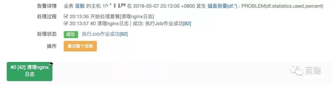 下面是Nginx模块磁盘告警的自愈示例,匹配Nginx模块的磁盘清理套餐,清理Nginx模块的日志文件,整个过程不到30秒。
