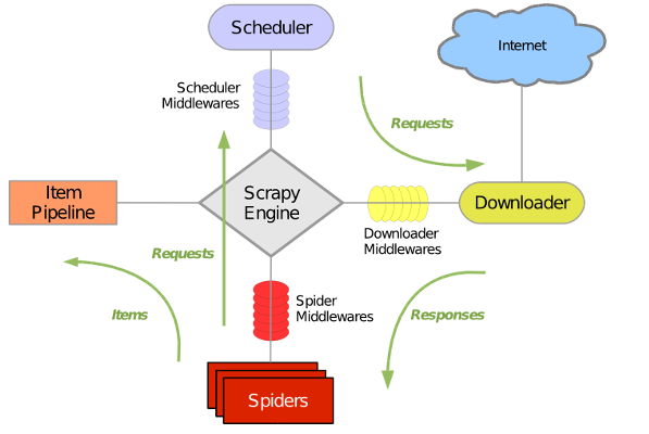 Scrapy 使用了 Twisted异步网络库来处理网络通讯。整体架构大致如下