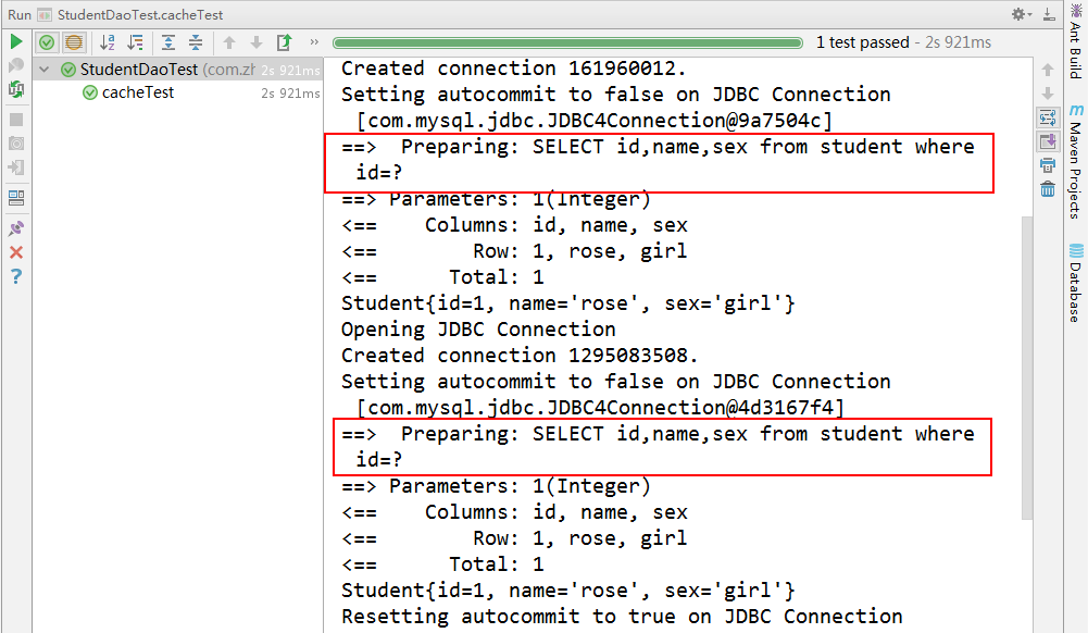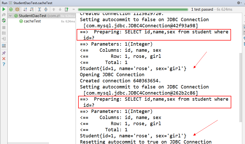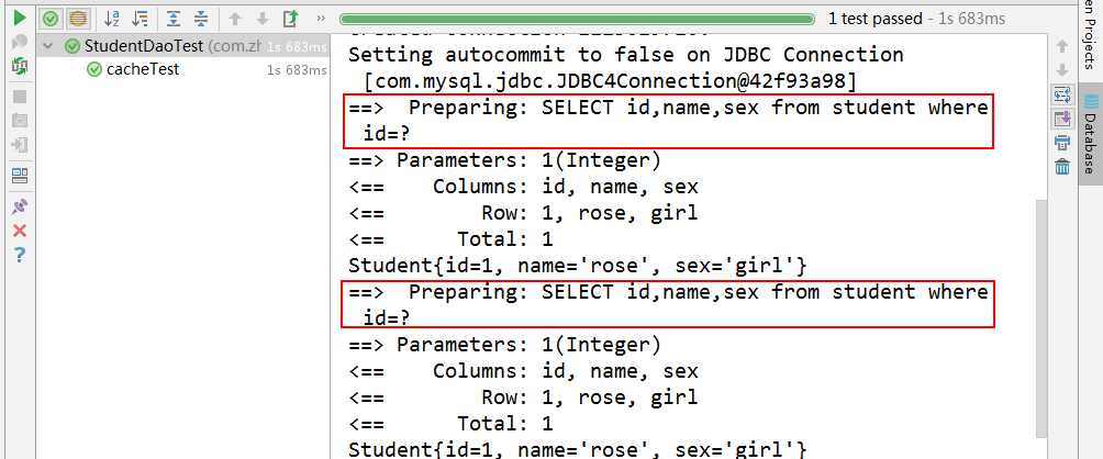 从上图可以看出此时并没有使用缓存,向数据库查询了二次,因为第二次查询使用的是新的会话,而一级缓存必须在同一个会话中。