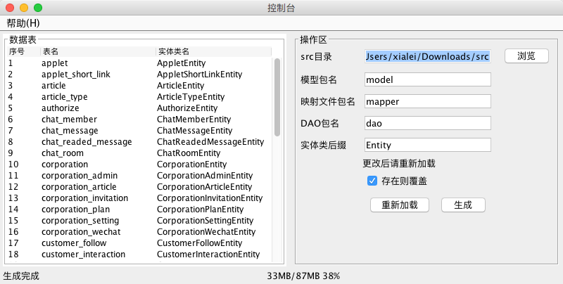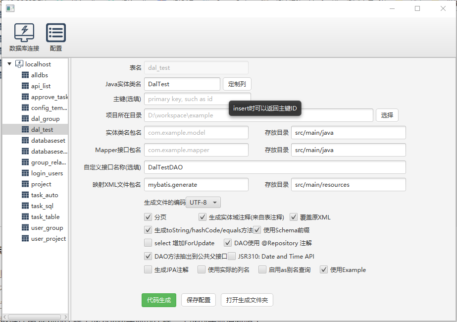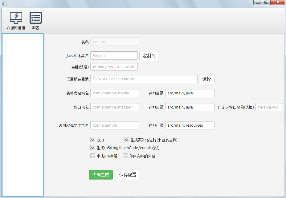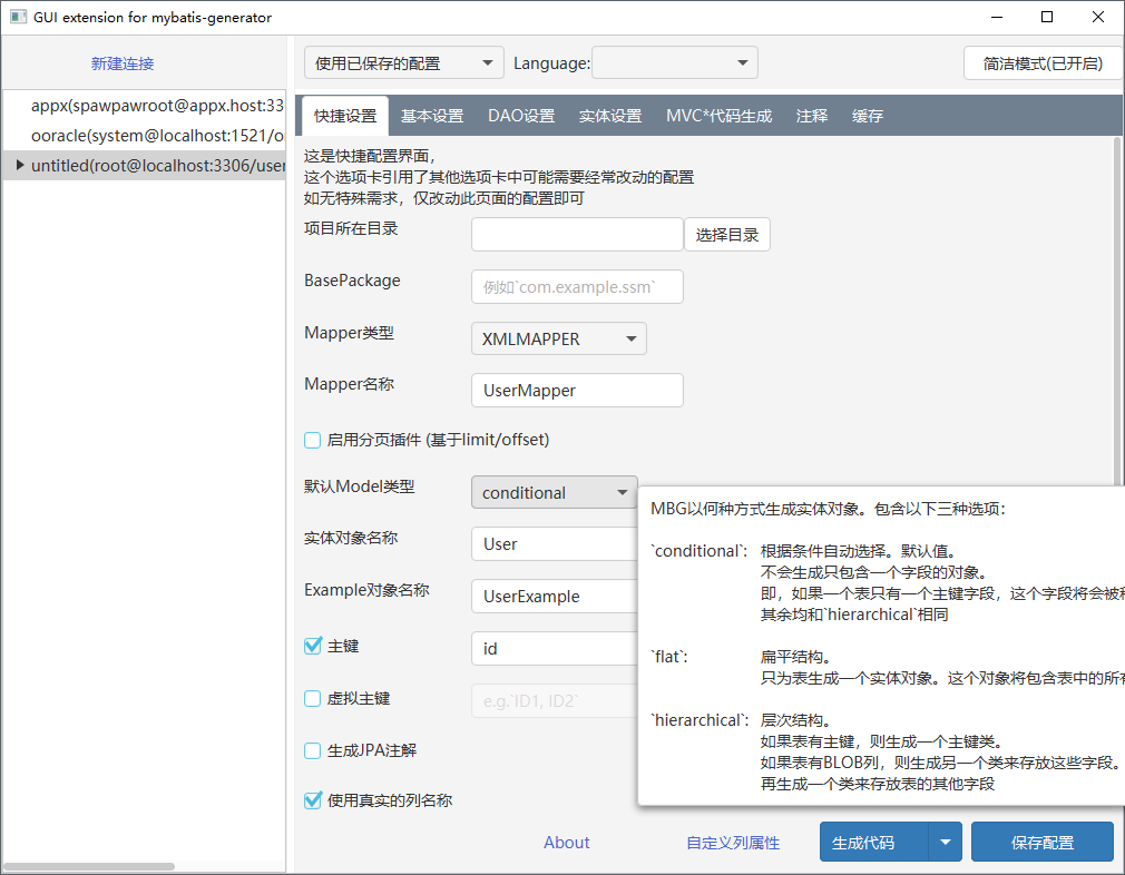 mybatis-generator-gui-extension是一个为MybatisGenerator编写的图形化界面,为实体/Example/Mapper提供了丰富的扩展。