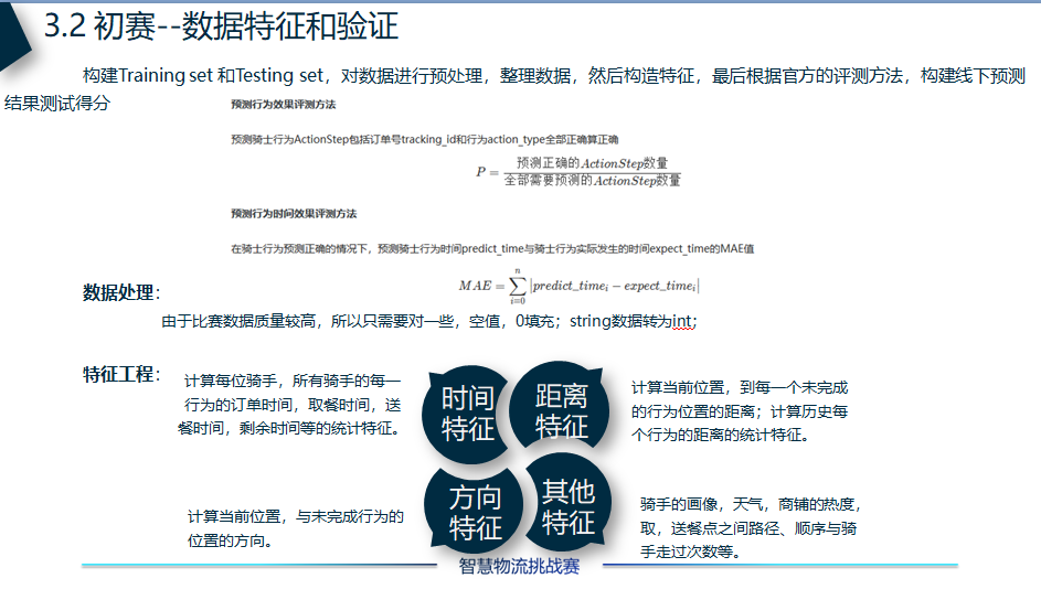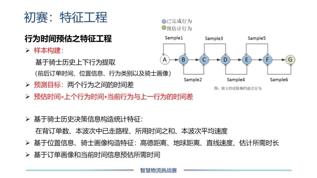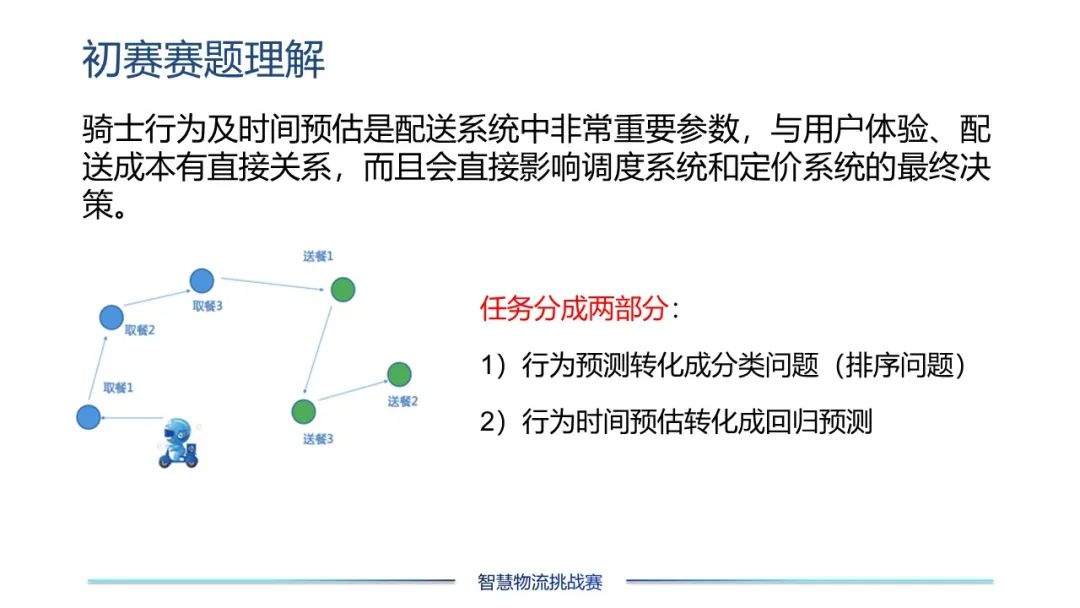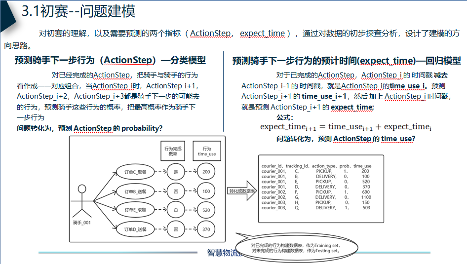 初赛的目标是对骑手的下一个动作和下一个动作完成的时间做预测。很明显,存在两个不同的目标:预测动作和预测时间。并且存在着逻辑先后关系:先有动作,再有时间。在这里我主要分享一下我们组对于第一个小任务:预测骑手动作的思路,因为预测时间相对来说更简单一些。