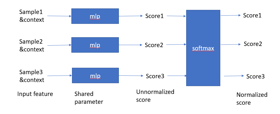 基于排序以及context化简的思想,我们的模型阐述如下:我们的模型基本结构是一个mlp模型,候选动作与其context叠加后送入共享参数的mlp模型进行打分。打分完成后,经过softmax对其进行归一化,并使用negative log loss 进行优化,negative log loss可以极大化正确选项的得分并且极小化不正确选项的得分,从而达到排序效果。