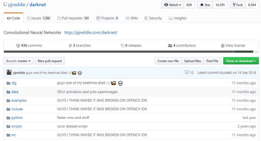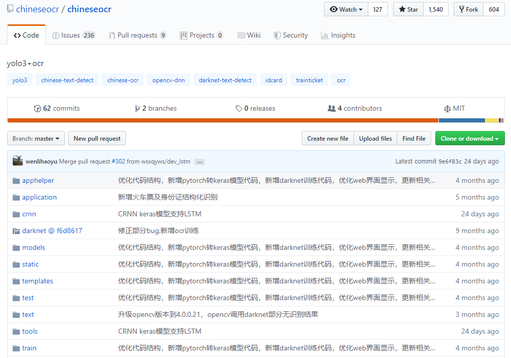 如果要使用darknet来进行文字检测,那么就需要再下载darknet源代码(如直接使用项目默认的keras yolo3检测方法,则跳过该步骤),在GitHub上下载ChineseOCR源代码(https://github.com/pjreddie/darknet),可直接下载成zip压缩包或者git克隆(git clone https://github.com/pjreddie/darknet.git)