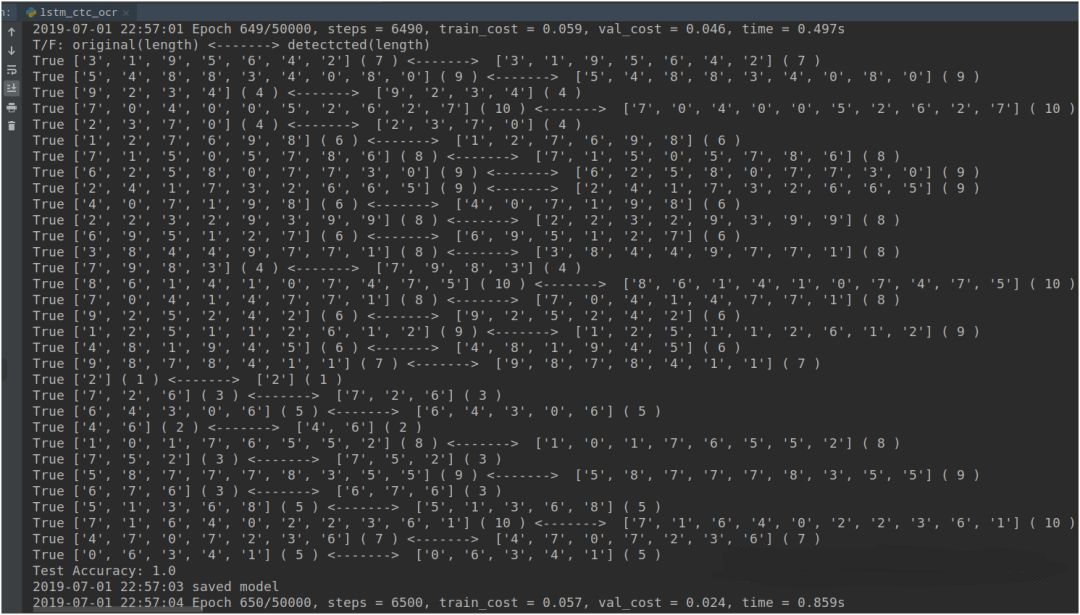 测试的结果如下,程序会批量读入数据后,输入原始结果(第一行)和预测结果(第二行),便于比较两者是否一致。