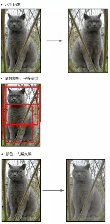 f. 样本增强:有一种观点认为神经网络是靠数据喂出来的,如果能够增加训练数据的样本量,提供海量数据进行训练,则能够有效提升算法的质量。常见的样本增强方式有:水平翻转图像、随机裁剪、平移变换,颜色、光照变换等,如下图所示: