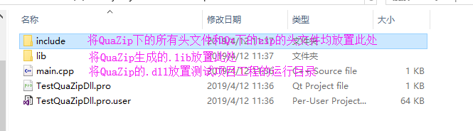 2-在测试工程目录下创建include,lib目录 注:用来存放quazip和zlib头文件 及 quazip生成的.lib文件 .dll文件存放至程序运行目录。