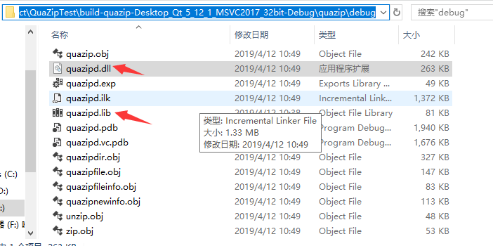 去生成目录下查看是否有对应的.lib,.dll文件的生成. 我当前是debug模式,所以去debug生成目录下找到quazip,查看此目录下是否有.lib,.dll文件生成。