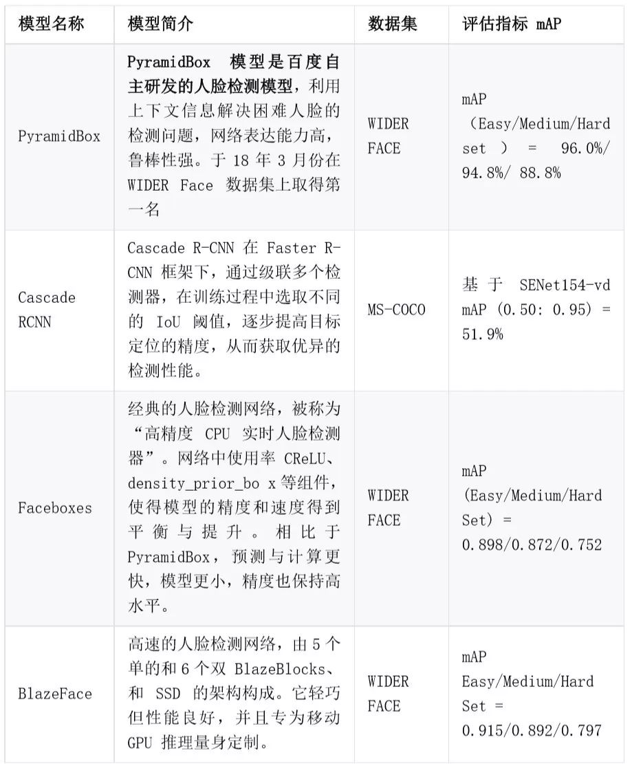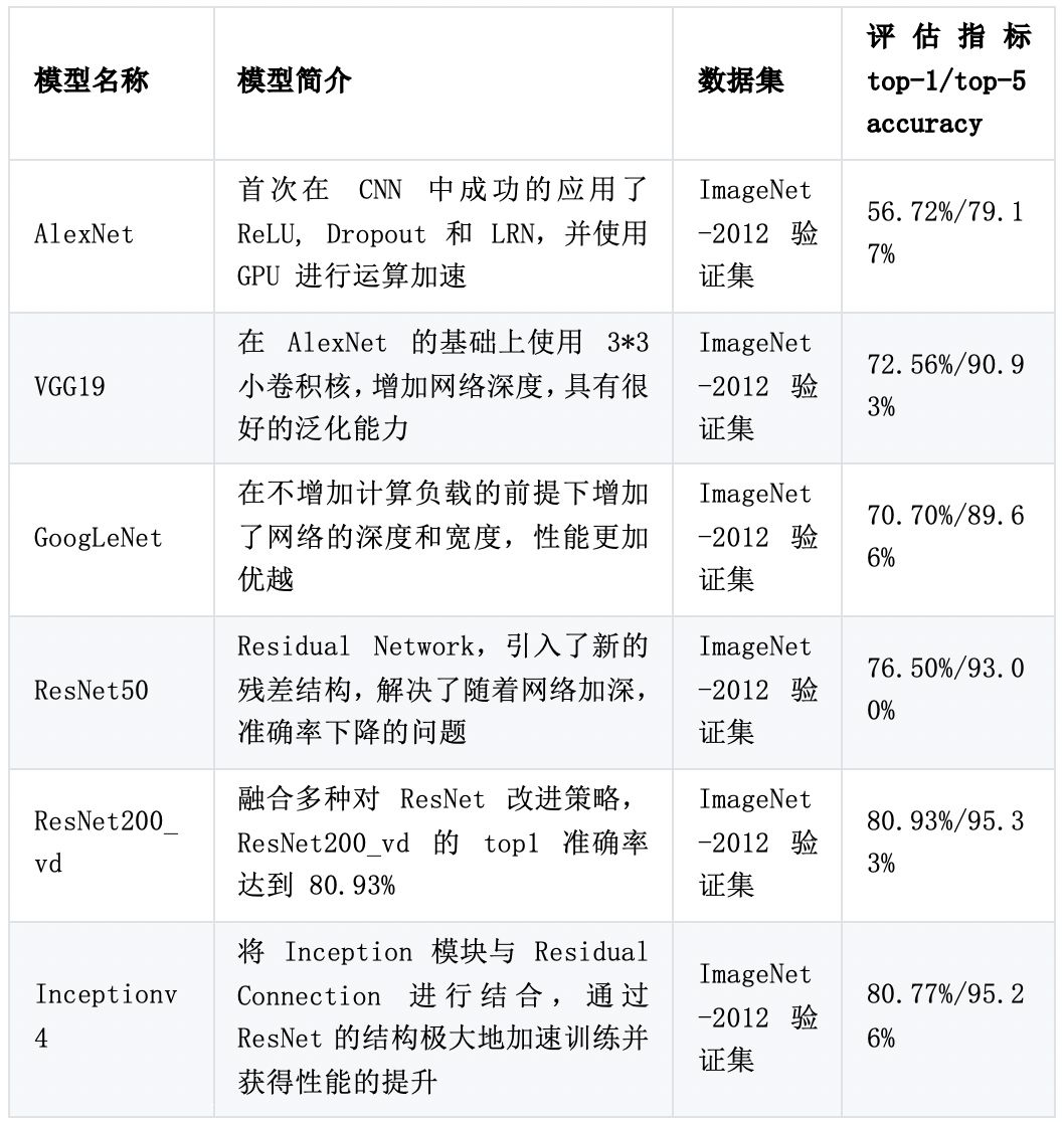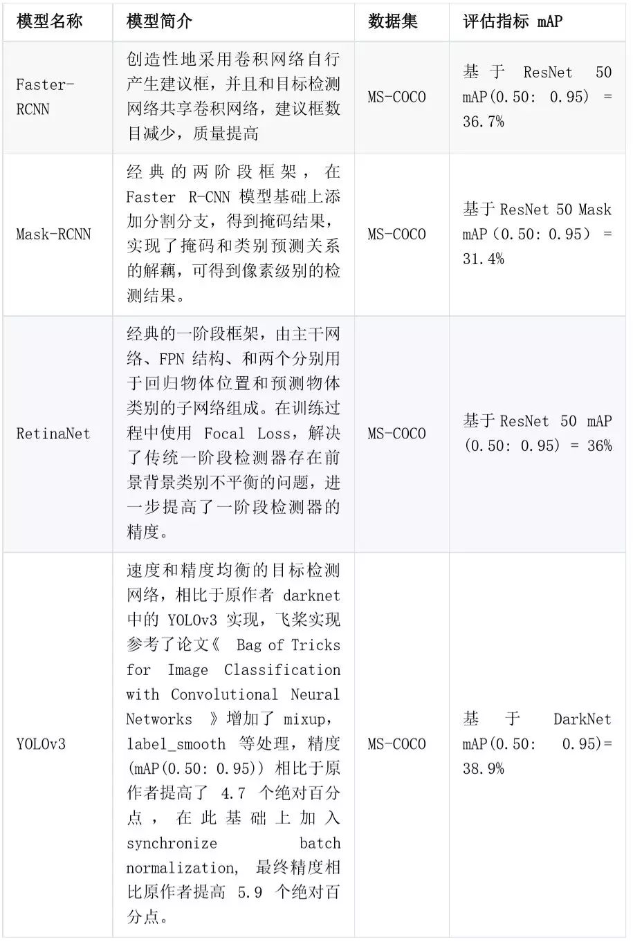 下面,我们将从主流四大领域分别为开发者介绍飞桨模型库的一些核心内容,因为算法模型数量众多且受限于篇幅,仅对算法模型的分类及名称、简介和应用场景、以及在不同数据集上的评价指标进行了整理。