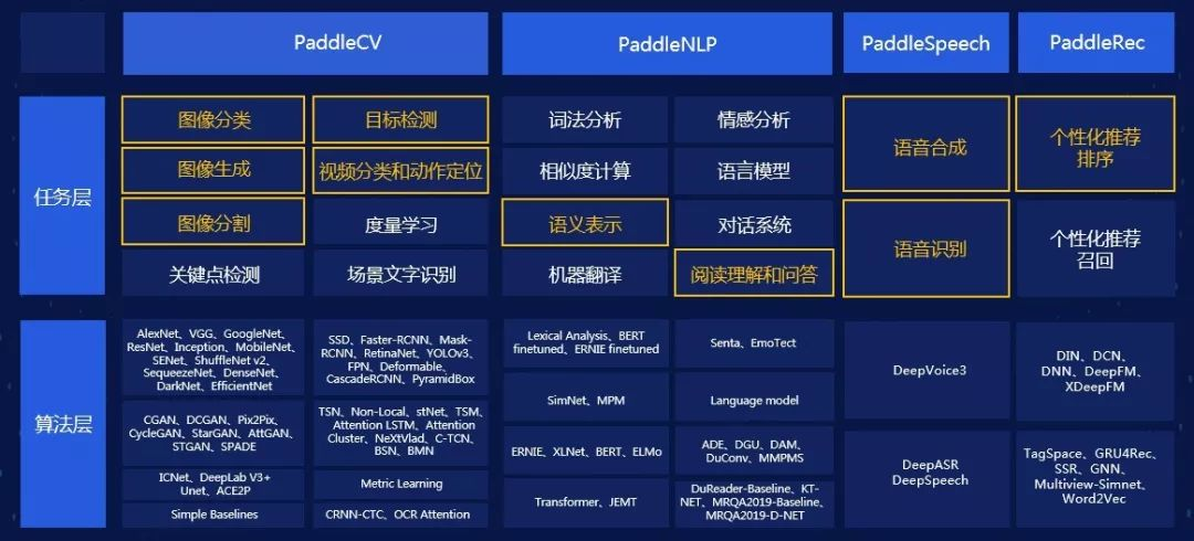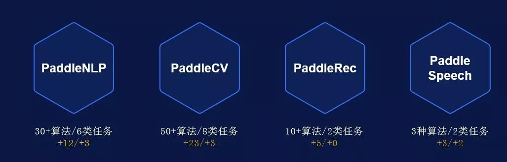 具体来看,在计算机视觉领域,飞桨在图像分类、生成、检测、视频理解、图像分割等领域都有新增的模型。在自然语言处理领域,飞桨在语义表示、阅读理解和问答上有升级,同样,在推荐、语音方面,都做了进一步的完善和升级。