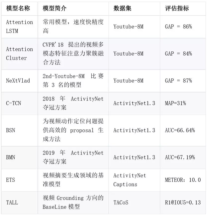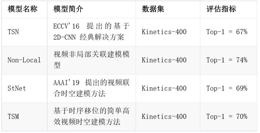 视频分类模型提供了提取全局时序特征的方法,主要方式有卷积神经网络 (C3D, I3D, C2D 等),神经网络和传统图像算法结合 (VLAD 等),循环神经网络等建模方法。