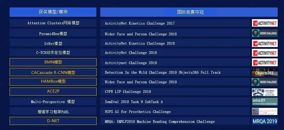 除了对于经典模型的支持,飞桨还开源了多项百度在国际竞赛中夺冠的算法模型,这里面既包括在计算机视觉领域的视频理解、人像分割,也包含自然语言处理领域的阅读理解。
