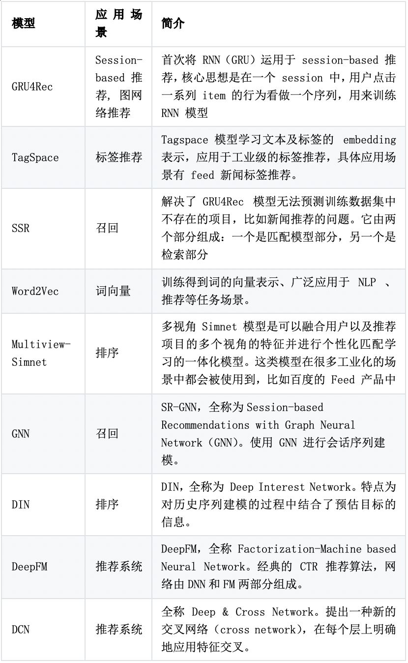 个性化推荐,在当前的互联网服务中正在发挥越来越大的作用,目前大部分电子商务系统、社交网络,广告推荐,搜索引擎,都不同程度的使用了各种形式的个性化推荐技术,帮助用户快速找到他们想要的信息。PaddleRec 包含的模型如下。