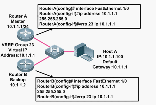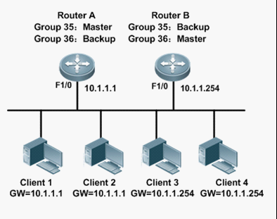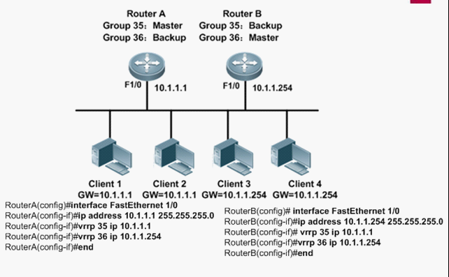 在正常状态下,PC1、PC2走RA,PC3和PC4走RB,但是两个路由器一旦出现故障,就将网关切换到备份路由器。RA和RB可以说是相辅相成的。