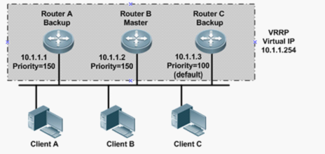 如下图所示: 虚拟IP为10.1.1.254,在VRRP组中没有IP地址拥有者,则比较优先级,很明显RB和RA的优先级要大于RC,则比较RA和RB的IP地址,RB的IP地址大。所以RB为组中的主路由器。