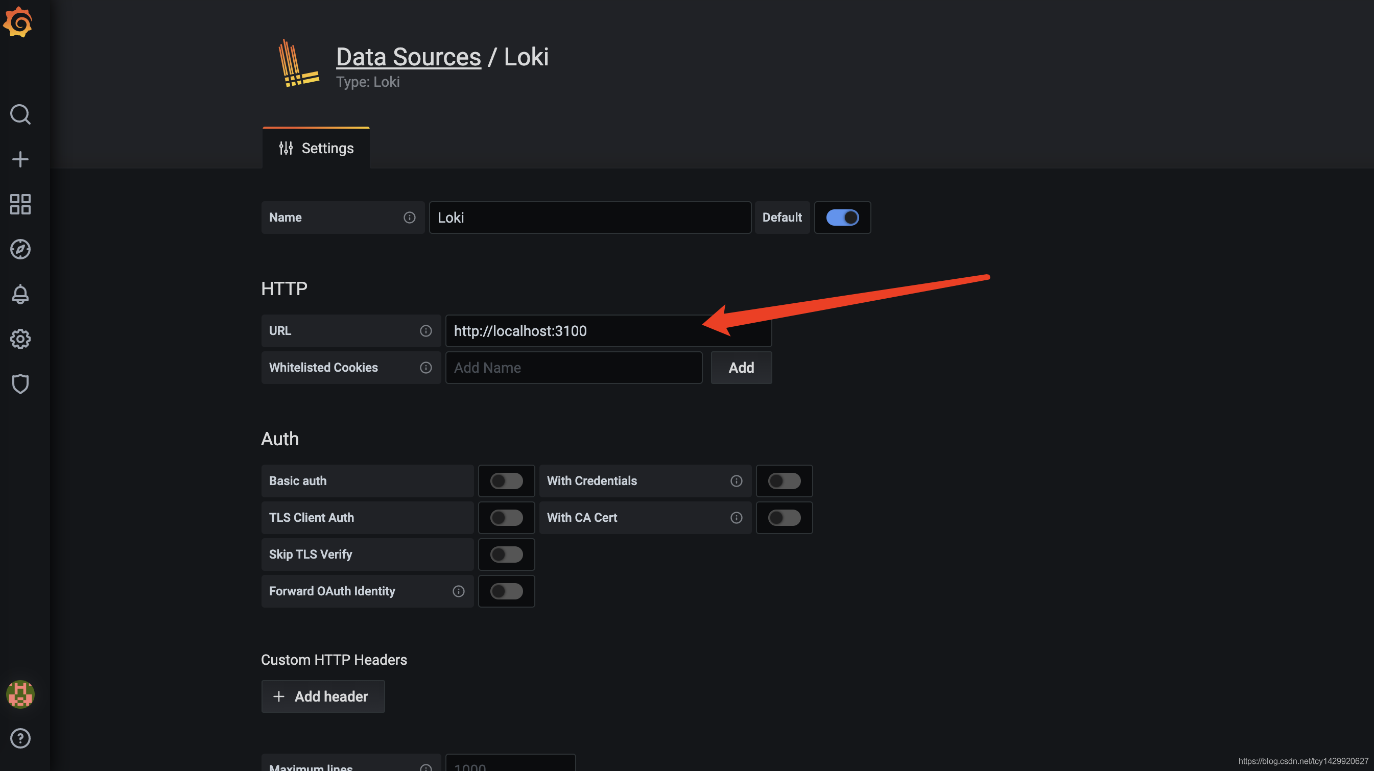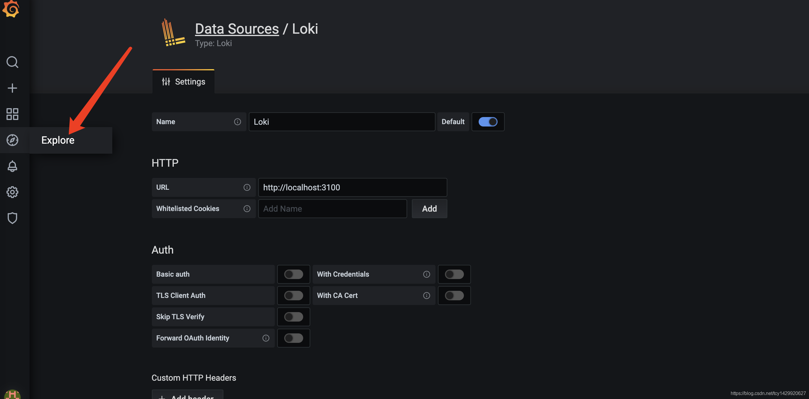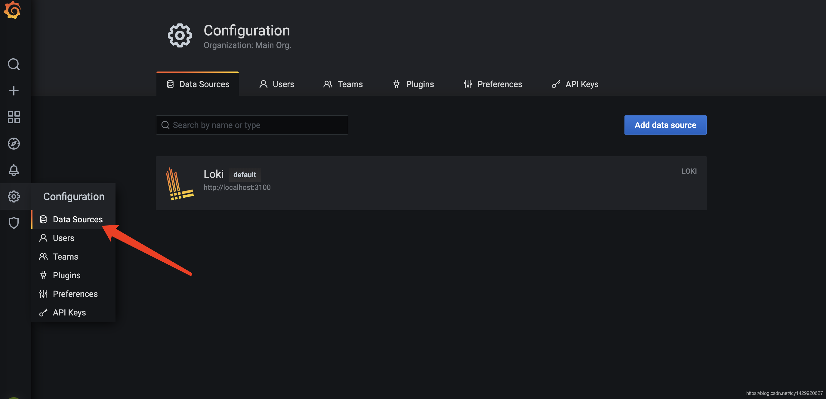 访问web页面:http://localhost:3000/ 进行登录(账号密码都是admin),点击下图中的位置,找到Loki,配置数据源。