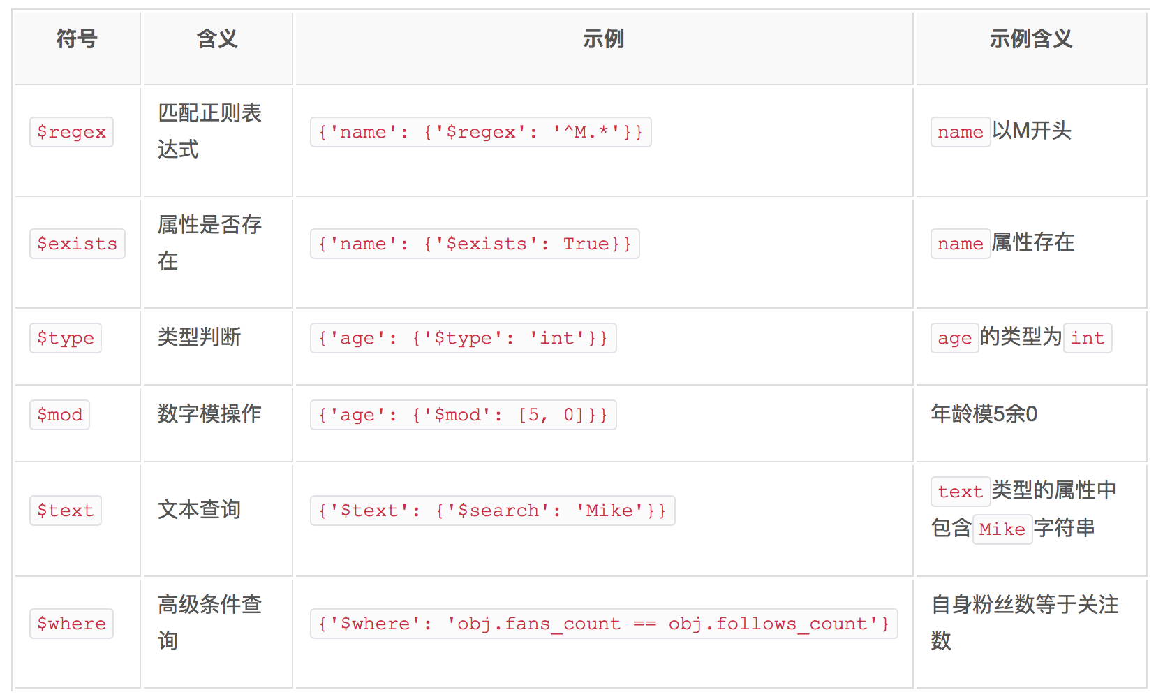这里查询的条件键值已经不是单纯的数字了,而是一个字典,其键名为比较符号$gt,意思是大于,键值为20。