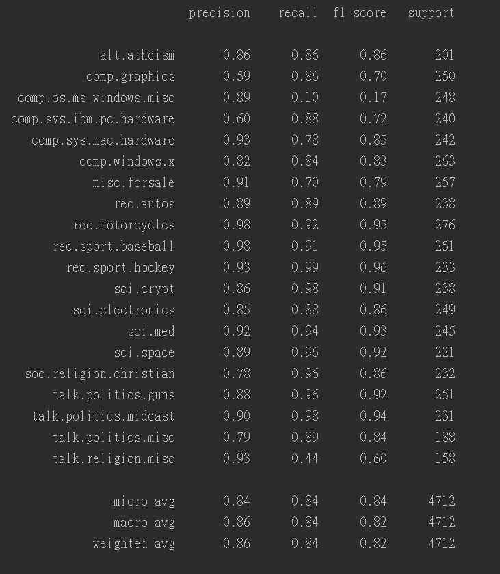 predict_proba则不同,它会给出测试集样本在各个类别上预测的概率。容易理解,predict_proba预测出的各个类别概率里最大值对应的类别,也就是predict方法得到类别。