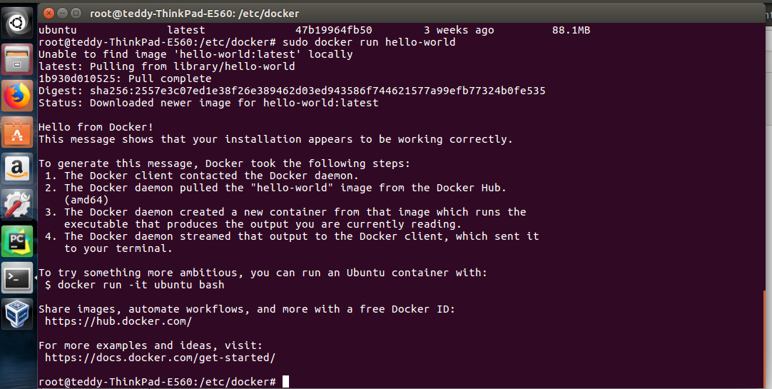 latest: Pulling from library/hello-world ca4f61b1923c: Already exists Digest: sha256:083de497cff944f969d8499ab94f07134c50bcf5e6b9559b27182d3fa80ce3f7 Status: Downloaded newer image for hello-world:latest