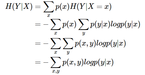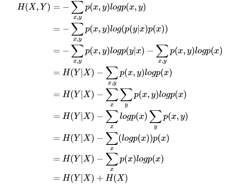 $H(X,Y)=-\displaystyle\sum_{x,y}p(x,y)logp(x,y)=-\sum_{i=1}^{n}\sum_{j=1}^{m}p(x_i,y_i)logp(x_i,y_i)$