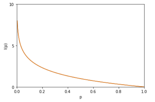其中负号是用来保证信息量是正数或者零。而 $log$ 函数基的选择是任意的(信息论中基常常选择为2,因此信息的单位为比特bits;而机器学习中基常常选择为自然常数,因此单位常常被称为奈特nats)。$I(x)$ 也被称为随机变量 $x$ 的自信息 (self-information),描述的是随机变量的某个事件发生所带来的信息量。图像如图: