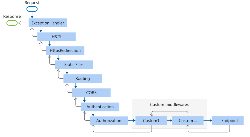 下图为asp .net core 中默认的中间件顺序,当然可以自己修改,但是这是一种推荐做法。