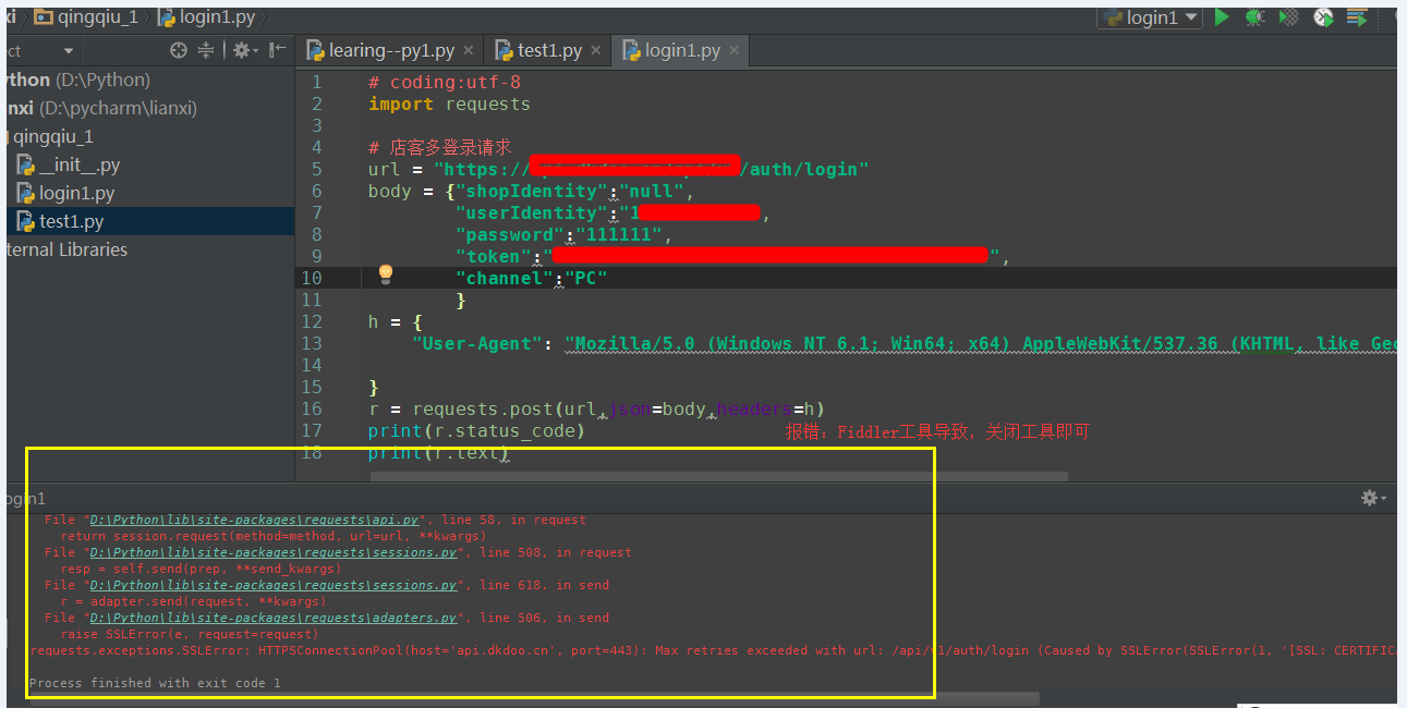 1、因为Fiddler正在运行原因,发送请求脚本时报错如下: