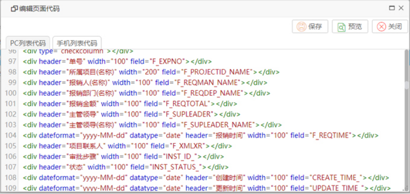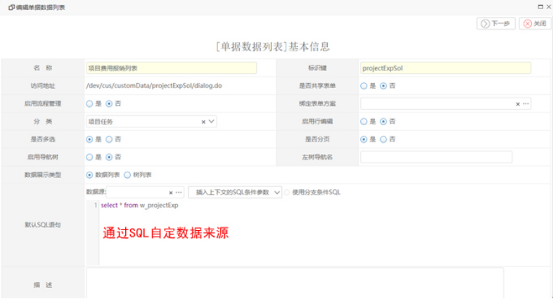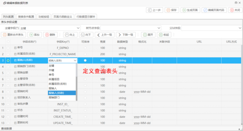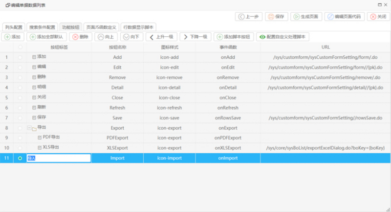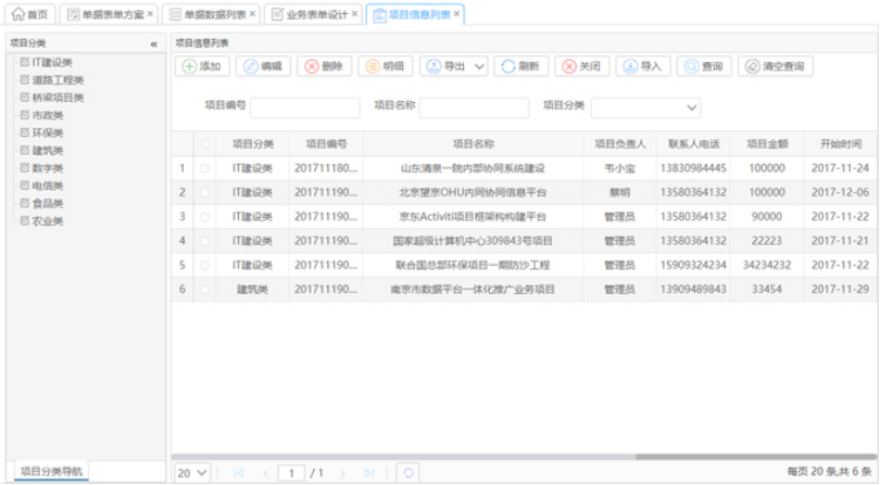 平台提供强大的数据列表生成功能,可以实现数据的普通列表展示,导航分类列表展示,树型数据展示。业务人员仅需要学会SQL语法,通过以下单据数据列表的工具,配置数据源、列表展示的表头、查询的字段、功能按钮及表单代码编辑。通过配置完成后,其可以展示以下的功能界面: