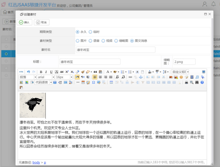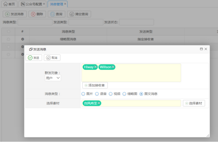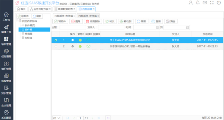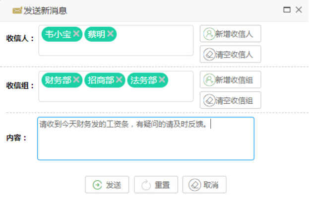 平台提供内部的短消息的收发处理,可有效在系统内进行消息的通知。结合后面外围的即时消息,可有效实现消息的即时收发。