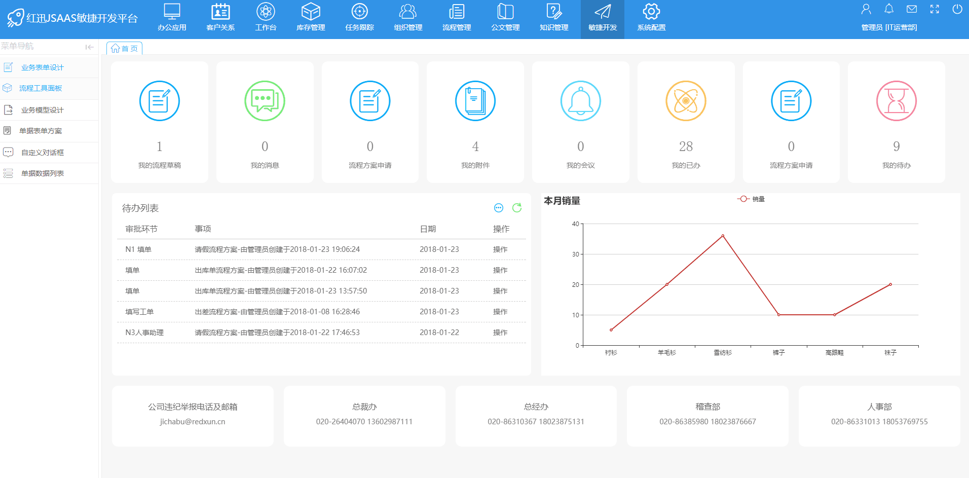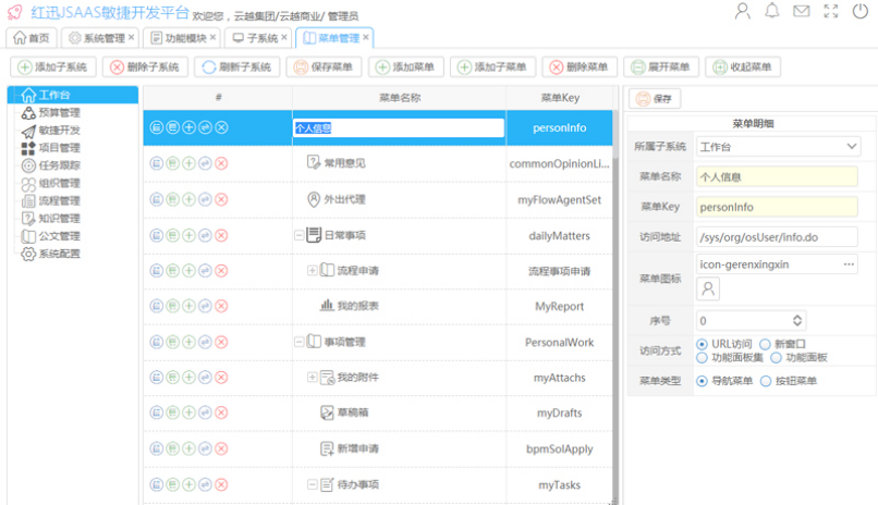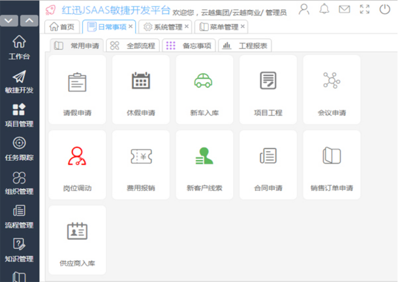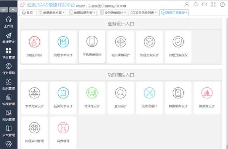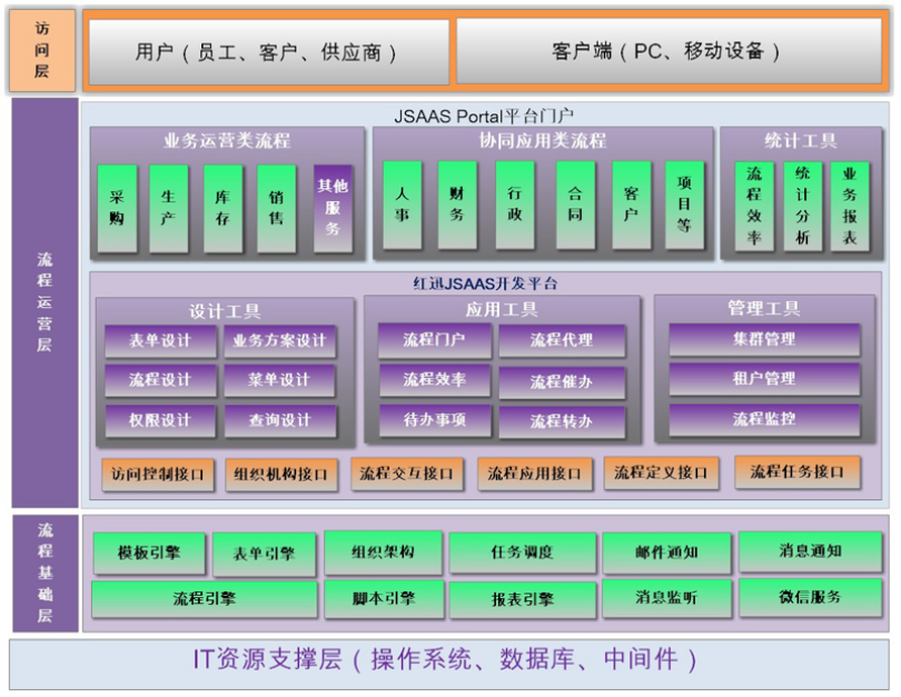 红迅JSAAS敏捷开发平台是广州红迅软件有限公司面向合作伙伴以及有IT运维团队中大型企业提供新一代的企业级的数据IT一体化的业务管理平台工具,它基于流行的JAVA开源技术上构建,扩展容易,学习成本低,可快速构建企业的一体业务管理中心,即满足企业以下的管理需要。