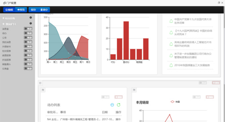 平台提供流行的在线报表管理功能,客户可线下进行报表设计,设计完成后,上传配置即可在线报表查看,并可配置于公司首页、部门首页或个人的首页、菜单等,展示风格可根据报表模板来定,同时实现在线报表展示及导出。