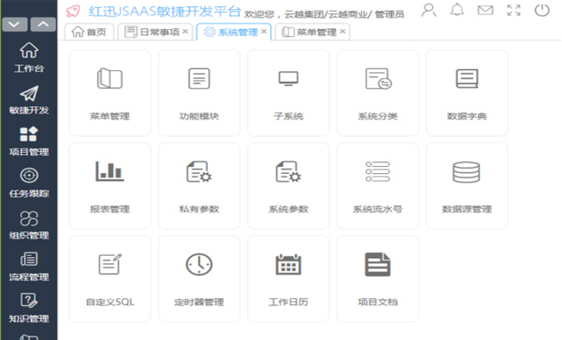 如菜单管理、数据字典管理、系统参数管理、系统访问日志管理、系统流程号管理,数据源管理,自定义SQL管理,任务调度管理,平台的工作日历,系统开发文档管理等。