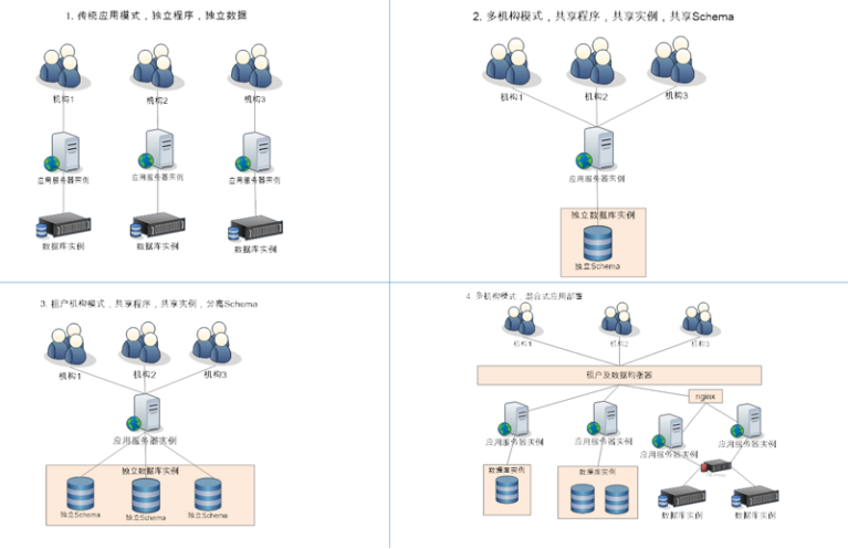 平台可根据参数配置,是否打开SAAS的功能支持,一旦打开,即支持同一套应用同时提供给多个租户使用,默认采用以下的第二种方式SAAS的应用支持