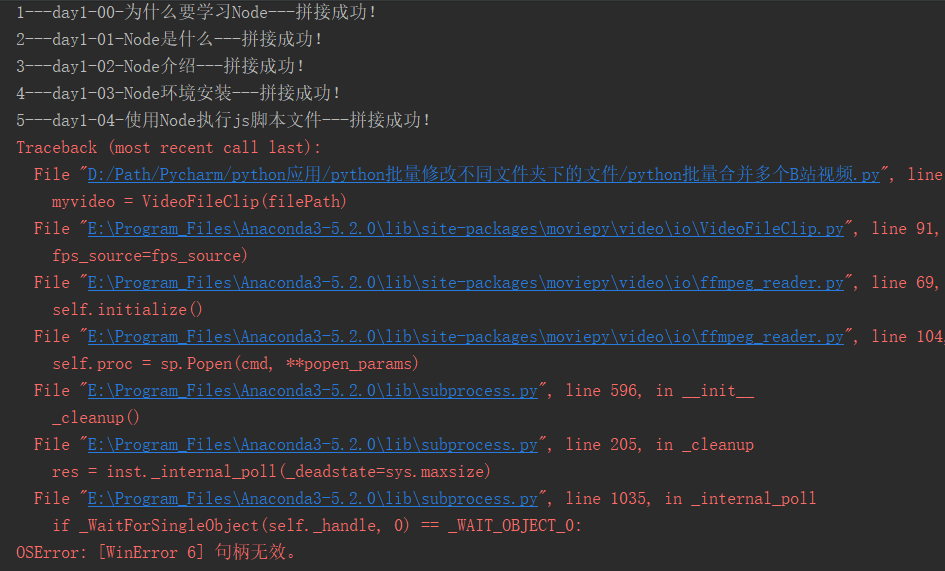 问题1:真正拼接视频时,发现会报错 OSError: [WinError 6] 句柄无效!