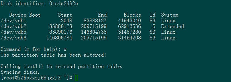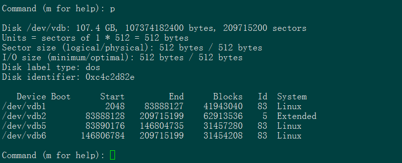 6、扩展分区2已创建,输入 p 查看是否成功: