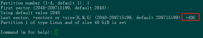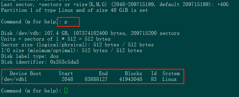 7、主分区已创建完成,大小40G。输入 p 查看分区是否成功,如图: