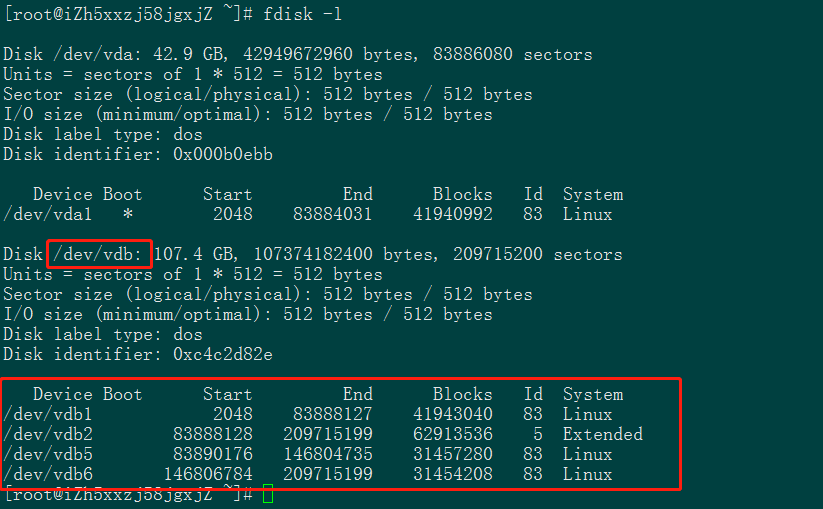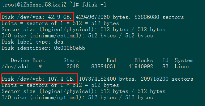 共两块磁盘,分别是,系统盘: /dev/vda 、数据盘: /dev/vdb