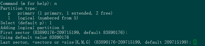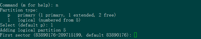 5、创建第二个逻辑分区,同第一逻辑分区创建方式相同,输入 n 回车,然后输入 l 回车选择逻辑分区,然后直接回车选择默认起始柱面,最后不设置磁盘大小直接回车