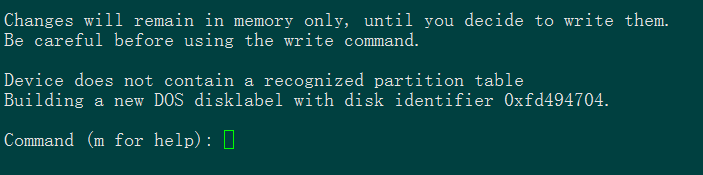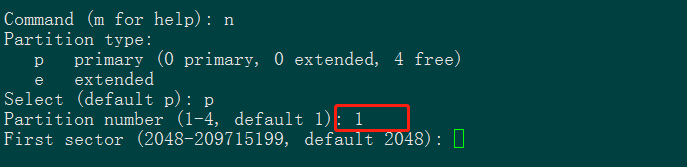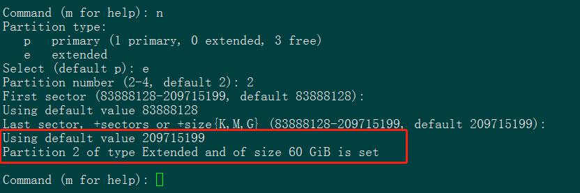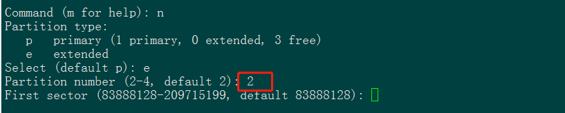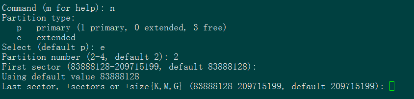 1、创建扩展分区,输入 n 回车 新建分区。如图: