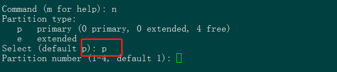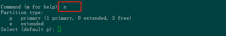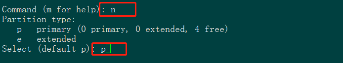 2、输入 n ,回车 新建分区。输入 p 选择分区类型(p-主分区、e-扩展分区)。如图: